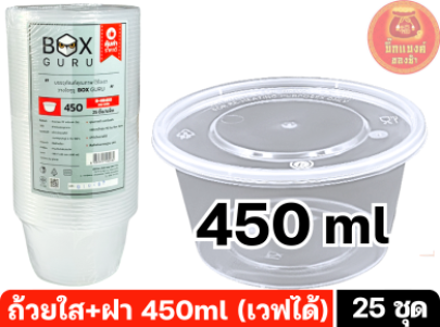 ถ้วยกลมใส+ฝา ขนาด 450ml. ตรา Box Guru - ฝาปิดสนิท ไม่เลอะ ไม่ซึม - พลาสติก PP แข็ง เหนียว วางซ้อนได้ - เข้าไมโครเวฟได้