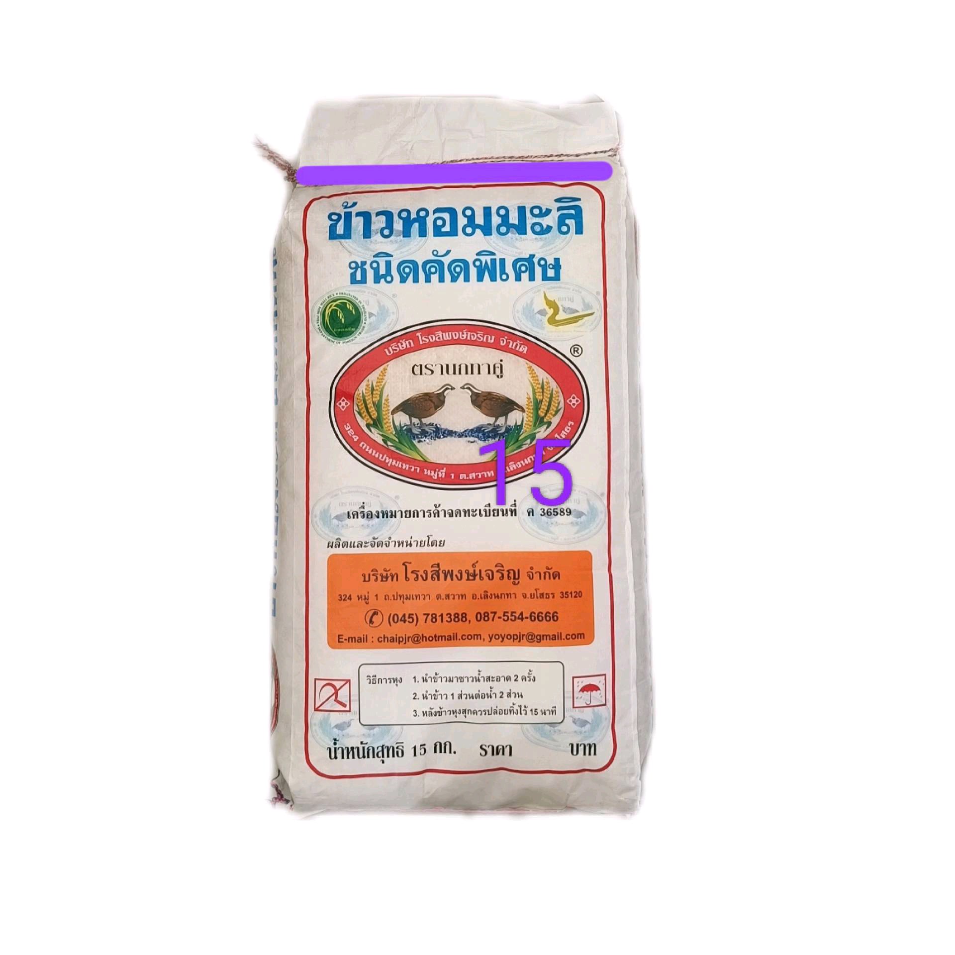 ข้าวหอมมะลิใหม่100% ตรานกทาคู่ 15กก. จากโรงสีพงษ์เจริญ จ.ยโสธร หอมกรุ่น นุ่มกินตามบ้าน