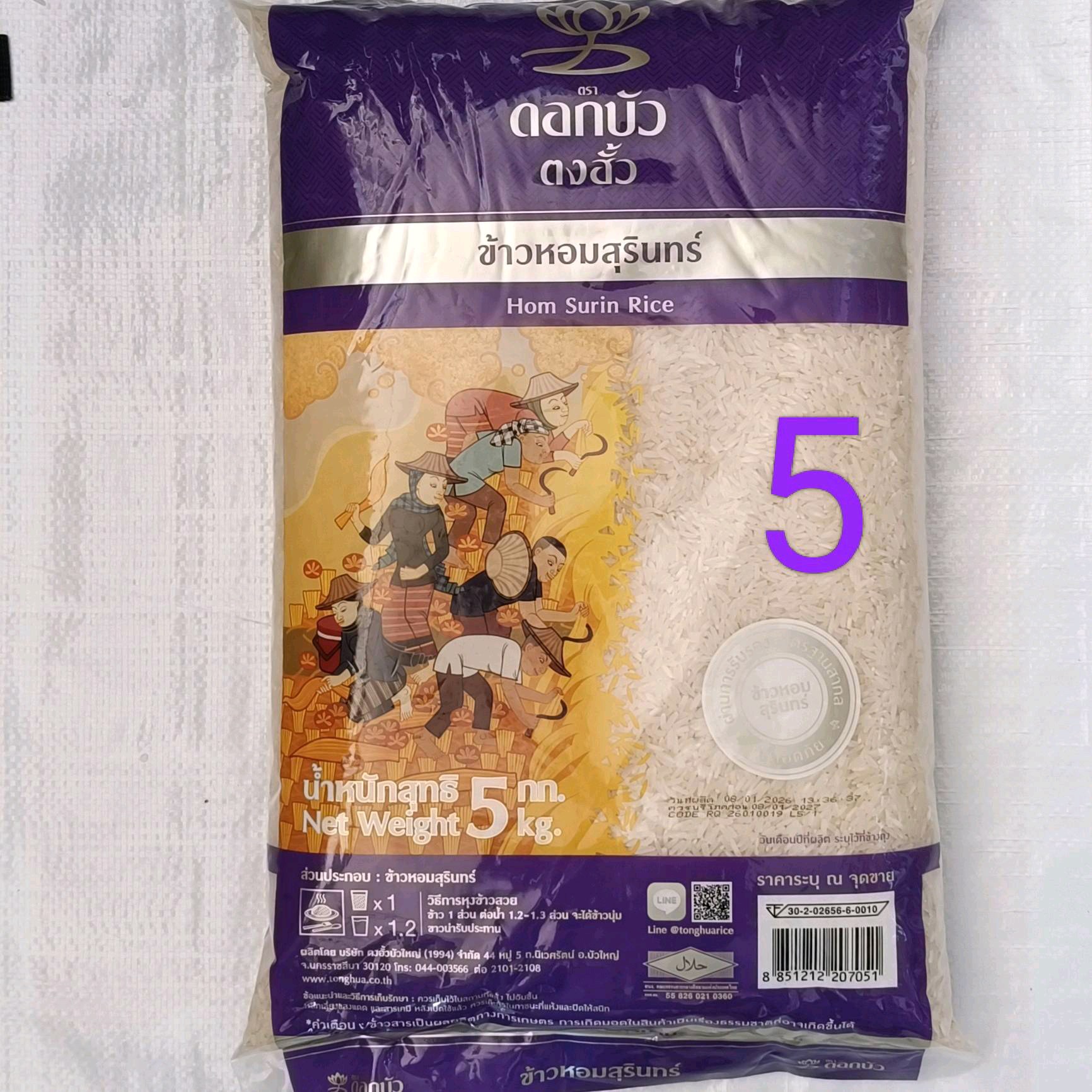 ข้าวหอมสุรินทร์ ตราดอกบัว ถุงม่วง 5กก. ข้าวหอมราคาประหยัด หุงขึ้นหม้อ โรงสีตงฮั้ว โคราช