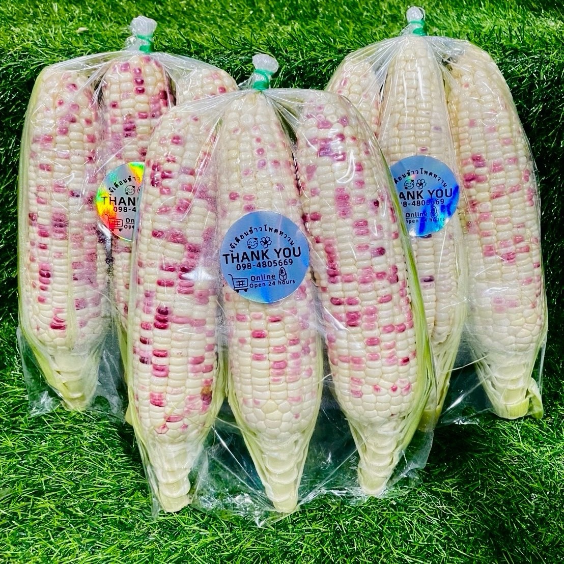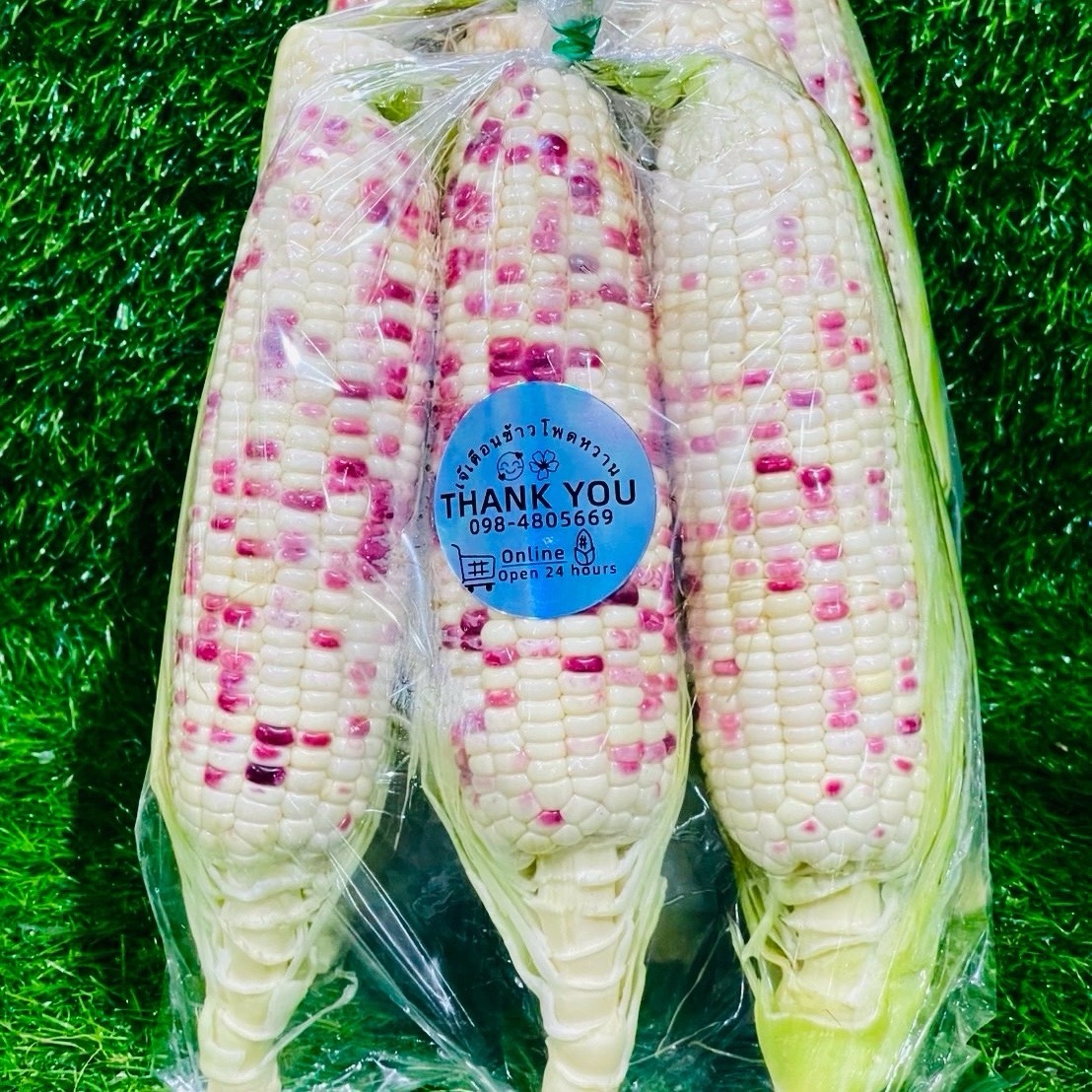 ข้าวโพดขาวม่วง ขาวชมพู สีสันแตกต่างกันไป เข้มบ้างอ่อนบ้างแล้วแต่ไร่ 1 แพ็คเล็ก มี 3 ฝัก