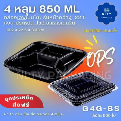 กล่องเวฟ เบนโต๊ะ 4 หลุม สีดำ พร้อมฝา ขนาด 850 ml ฝาใส ไร้ฝ้า กันไอน้ำ 1 แพ็ค บรรจุ 25 ชุด