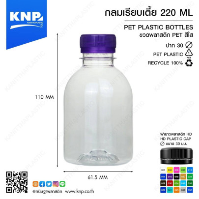 ขวด กลมเรียบเตี้ย พร้อมฝา ขนาด 220 ml ปาก 30 / 1 แพ็ค บรรจุ 150 ขวด