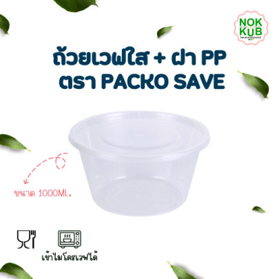 ถ้วยเวฟใส+ฝา - 1000ml. ยี่ห้อ PACKO SAVE (25ชิ้น/แพ็ค) พลาสติกเนื้อ PP สามารถเข้าไมโครเวฟได้ทั้งกล่องและฝา