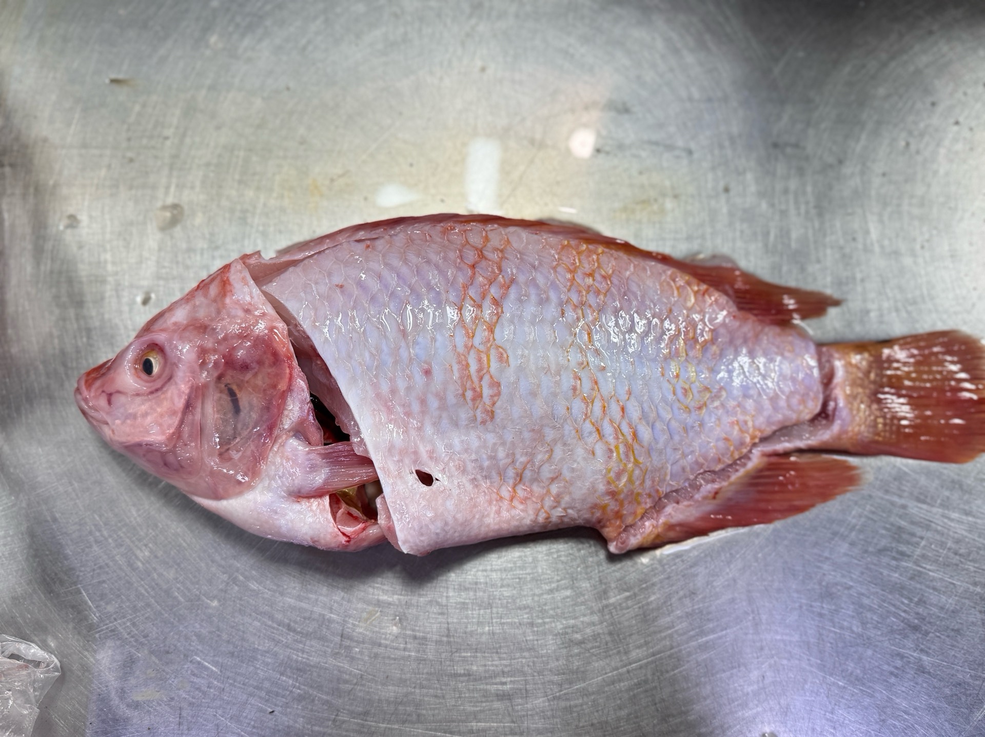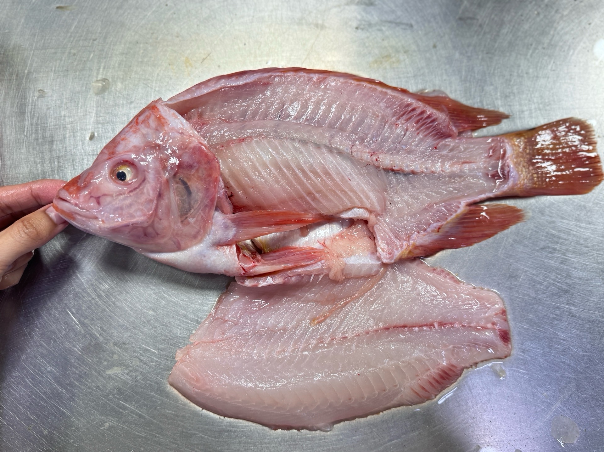 ปลาทับทิม ขนาดประมาณ 8 ขีด ถึง 1 กิโลกรัมต่อตัว แร่เนื้อ หัวก้างติดกัน