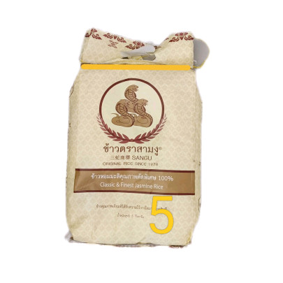 ข้าวหอมมะลใหม่ 100% ตราสามงูเชือกเหลือง 5กก. จากจังหวัดเชียงราย หอมมะลิชื่อดัง คัดข้าวเปลือกอย่างพิถีพิถัน หอม อร่อย