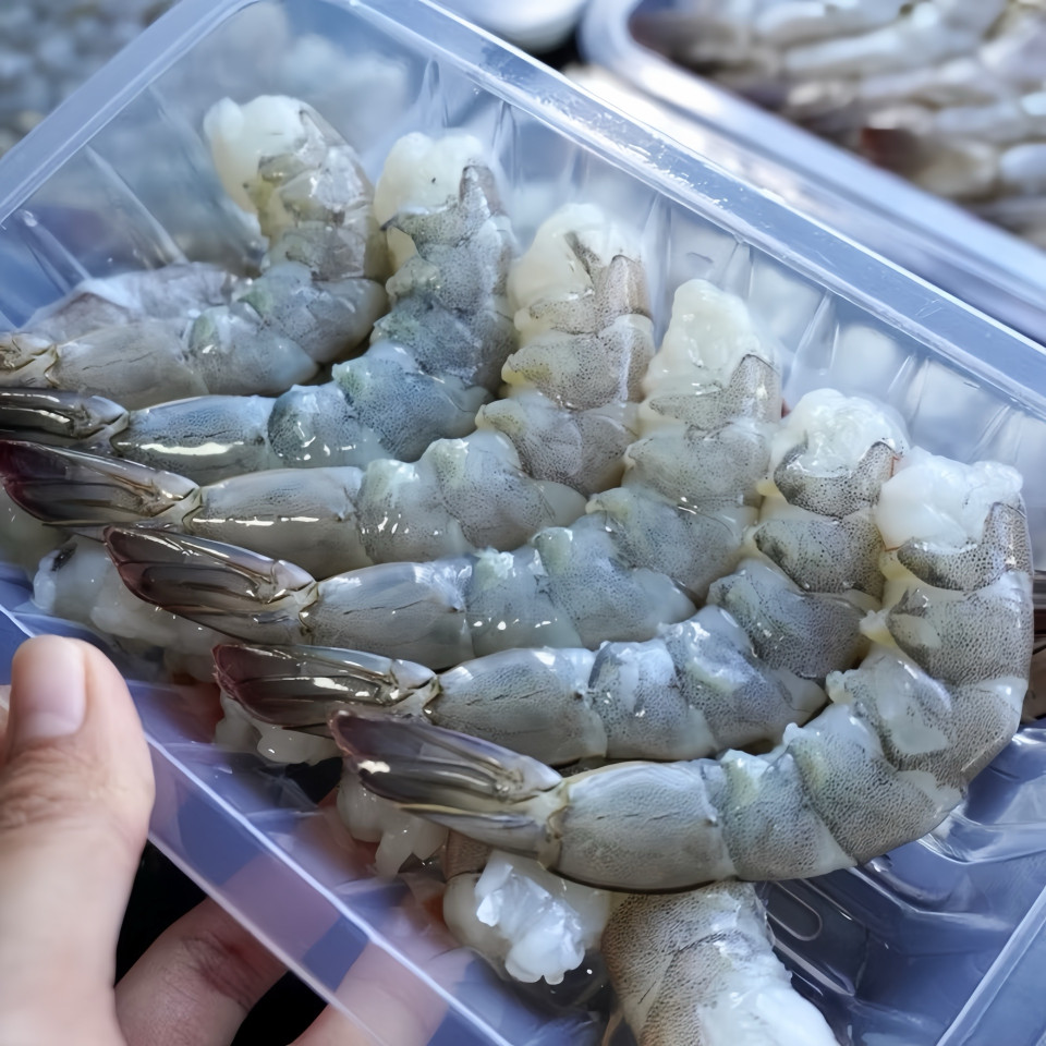 กุ้งเกษตรขาวแกะไว้หาง 42 ถึง 49 ตัวต่อกิโลกรัม (น้ำหนัก 1 กิโลกรัม ชั่งก่อนแกะค่ะ )