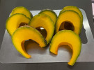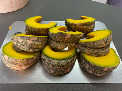 ฟักทองศรแดงลายข้าวตอกปอกหั่นเป็นชิ้นใหญ่ติดเปลือกสะดวกในการนำไปประกอบอาหาร
