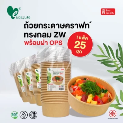 ชามกระดาษคราฟ พร้อมฝา OPS ไม่เป็นไอน้ำ ขนาด 1,300 ml ตรา EASY LIFE บรรจุ 300 ชุด / ลัง