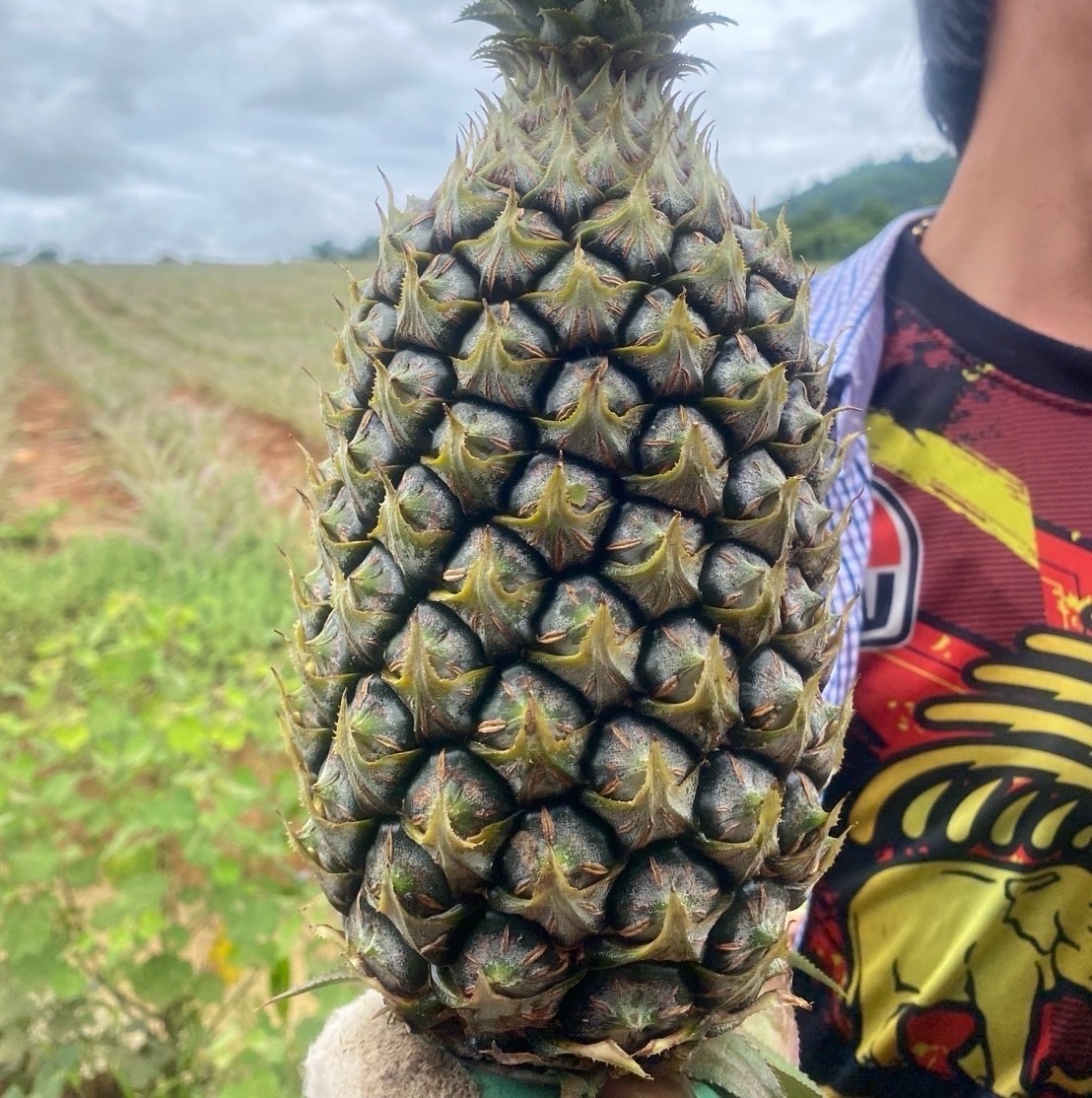 สัปปะรดตราดสีทอง เนื้อหนึ่ง 1 ลูก น้ำหนัก 1 .2 กิโลกรัม ถึง 1.5 กิโลกรัม สัปปะรดสุกเนื้อสีเหลืองหวาน กรอบ พร้อมรับประทาน